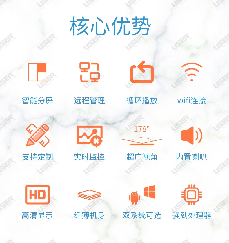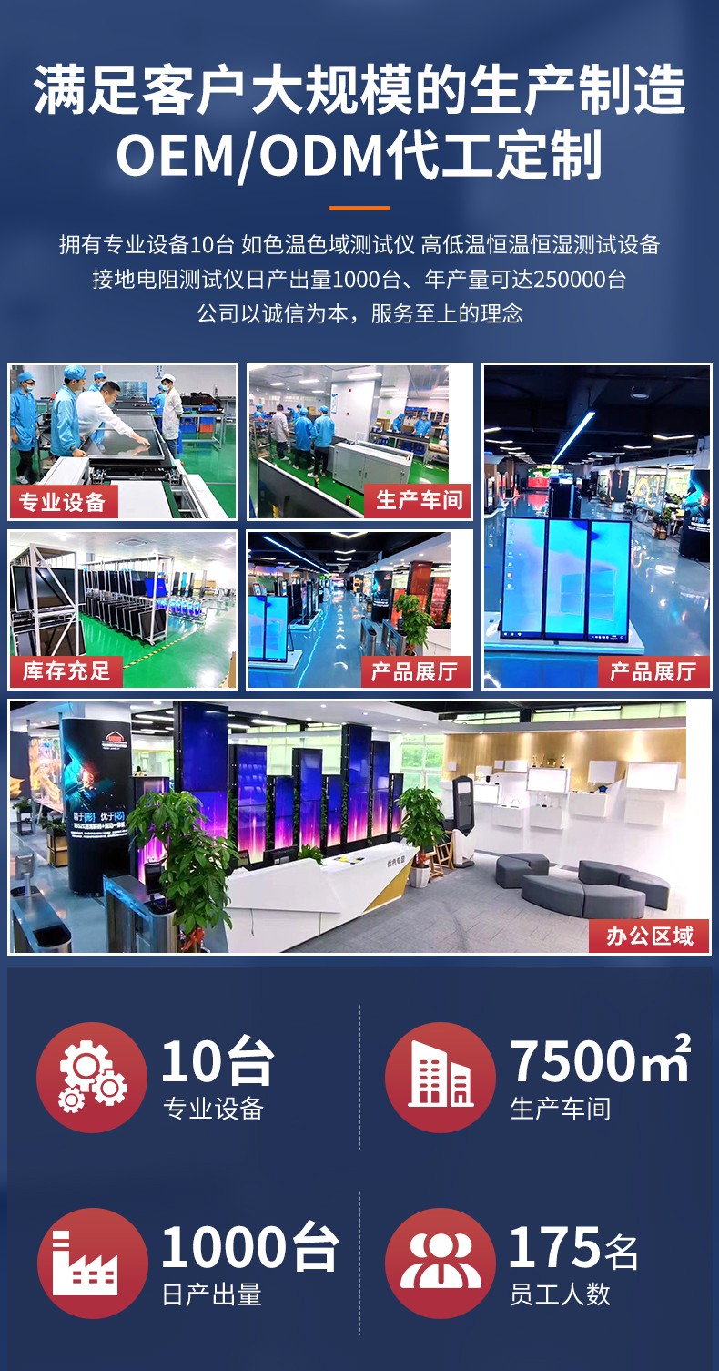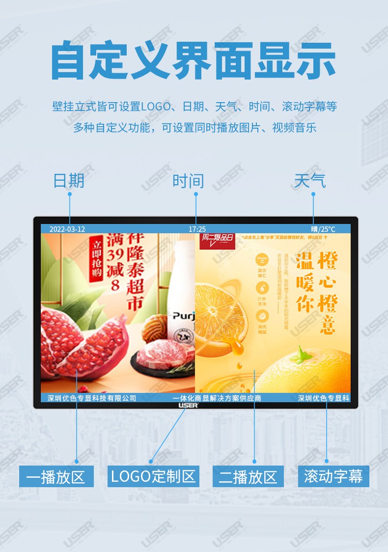 菜單產(chǎn)品中心Product center 液晶廣告機 壁掛式廣告機 落地立式廣告機 電梯超薄廣告機 車載廣告機 高亮廣告機 戶外廣告機 液晶拼接屏 專業(yè)液晶拼接屏 4K液晶拼接屏 廣告拼接屏 無縫液晶拼接屏 觸摸液晶拼接屏 LED顯示屏 觸控一體機 壁掛式觸控一體機 立式觸控一體機 斜面觸控一體機 智能家居觸控一體機 戶外觸控一體機 液晶電子白板 教育電子白板 會議電子白板 工控一體機 觸摸顯示器 紅外觸摸顯示器 電容觸摸顯示器 電阻觸摸顯示器 聲波觸摸顯示器 納米觸摸顯示器 液晶監(jiān)視器 專業(yè)級監(jiān)視器 4K監(jiān)視器 嵌入式監(jiān)視器 機架式監(jiān)視器 開放式監(jiān)視器 SDI監(jiān)視器 高亮監(jiān)視器 廣播級監(jiān)視器 工業(yè)顯示器 4K顯示器 機架式顯示器 開放式顯示器 醫(yī)療顯示器 KVM顯示器 指揮室顯示器 智慧校園產(chǎn)品 專業(yè)定制商顯 多屏廣告機 多功能觸控一體機 多功能廣告機 微信打印廣告機 魔鏡廣告機 透明廣告機 全息廣告機 條形屏廣告機 旋轉(zhuǎn)廣告機 裸眼3D廣告機 人工智能產(chǎn)品 顯示配套設(shè)備 拼接配套設(shè)備 廣告機播放盒 OPS播放盒 拼接支架 移動支架 相關(guān)軟件 吊頂支架 線材 木架 蜂窩箱 桌面底座 熱門產(chǎn)品 →優(yōu)色3.5mm超窄邊46寸液晶拼接屏→優(yōu)色49寸3.5mm超窄邊液晶拼接屏→優(yōu)色3.5mm超窄邊55寸液晶拼接屏 您的位置:首頁 → 公司產(chǎn)品 → 液晶廣告機 → 壁掛式廣告機 55寸壁掛廣告機類別:壁掛式廣告機 簡介:1 顯示屏幕 采用商用級A規(guī)屏(使用壽命:60000小時)。 2 控制主板 安卓3288高清音視頻解碼芯片。 3 鋼化玻璃 采用超白優(yōu)質(zhì)鋼化玻璃(透光率≥98%)。 4 外 框 采用高強度鋁合金外框(抗拉強... 在線咨詢 返回列表 產(chǎn)品說明 相關(guān)產(chǎn)品 100寸壁掛廣告機 98寸壁掛廣告機 86寸壁掛廣告機 85寸壁掛廣告機 75寸壁掛廣告機 70寸壁掛廣告機