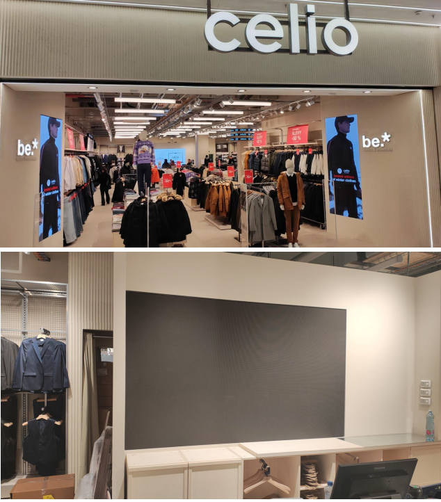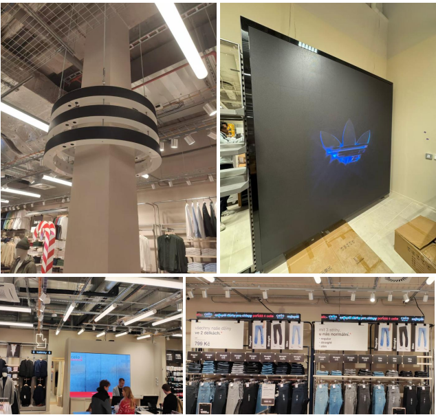 服裝連鎖門店LED大屏、吊裝圓環LED屏、條型LED顯示屏、貨架屏